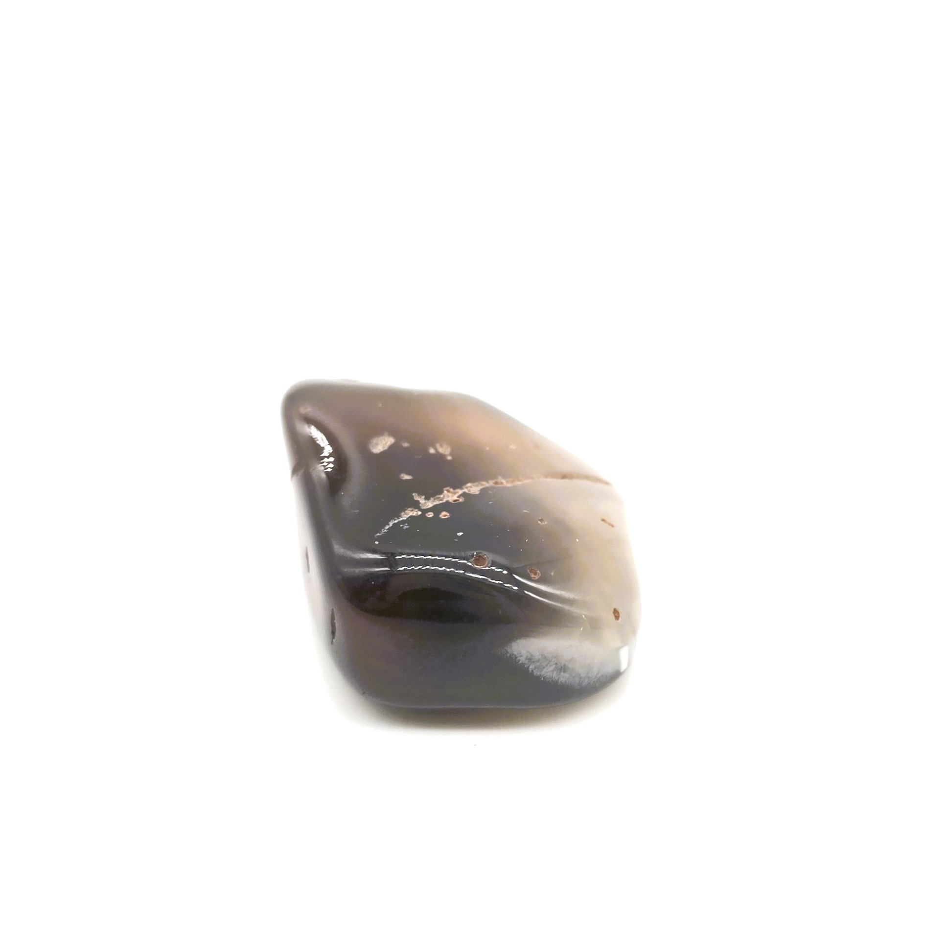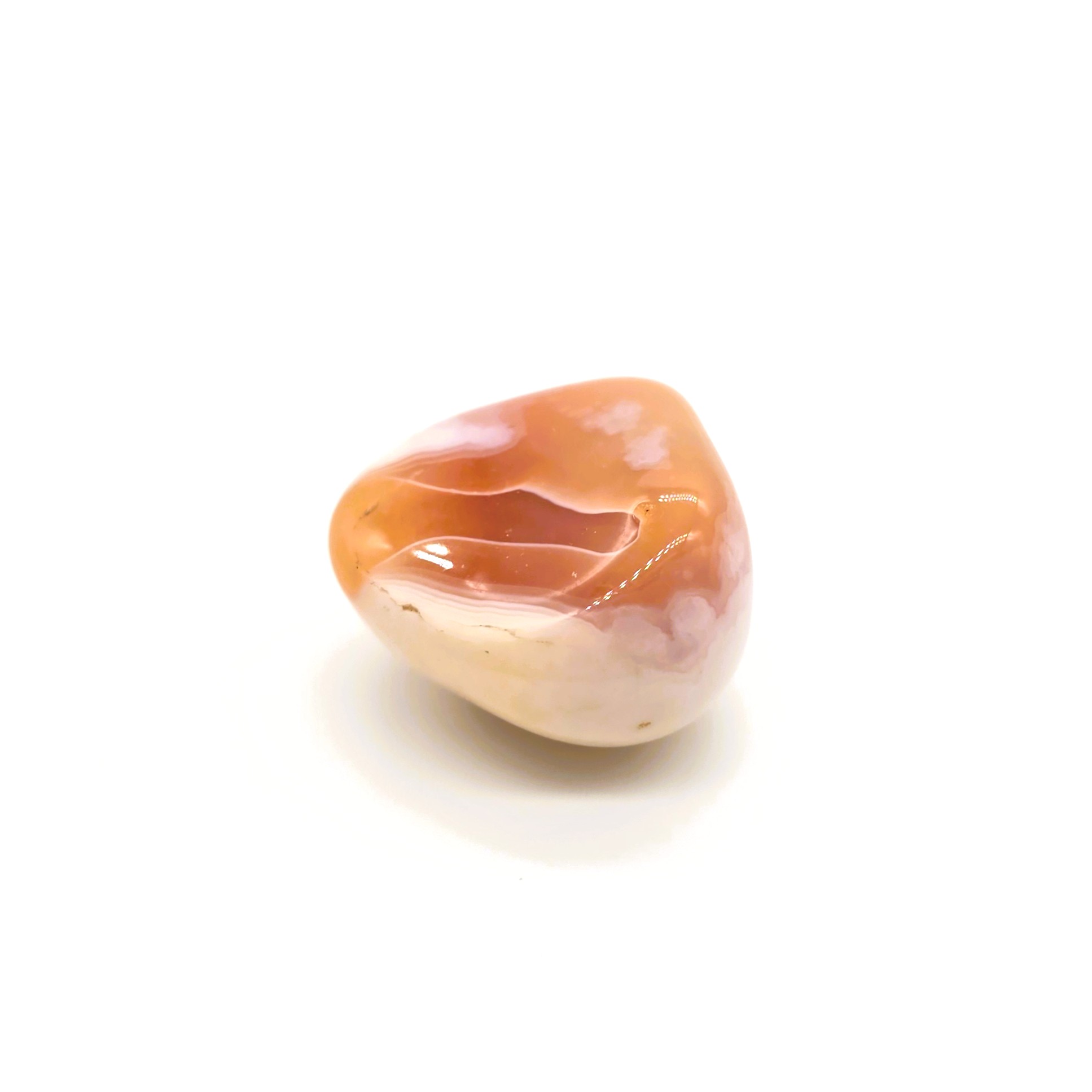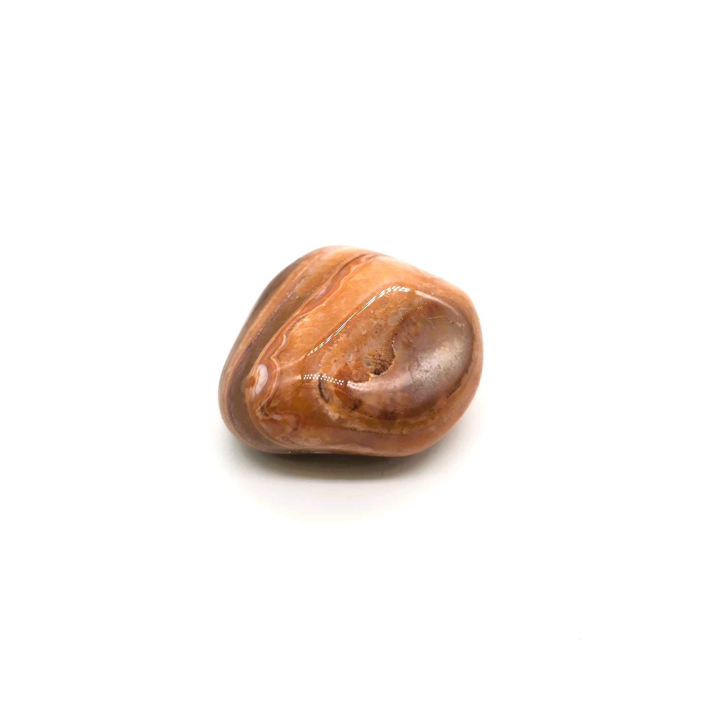 Questa pietra è una variante di agata ricca di ossidi di ferro, con calde tonalità rosso-arancio e una caratteristica fascia bianca centrale. Proveniente dagli stessi giacimenti del Botswana, unisce l’energia della terra vulcanica alla purezza del quarzo.
